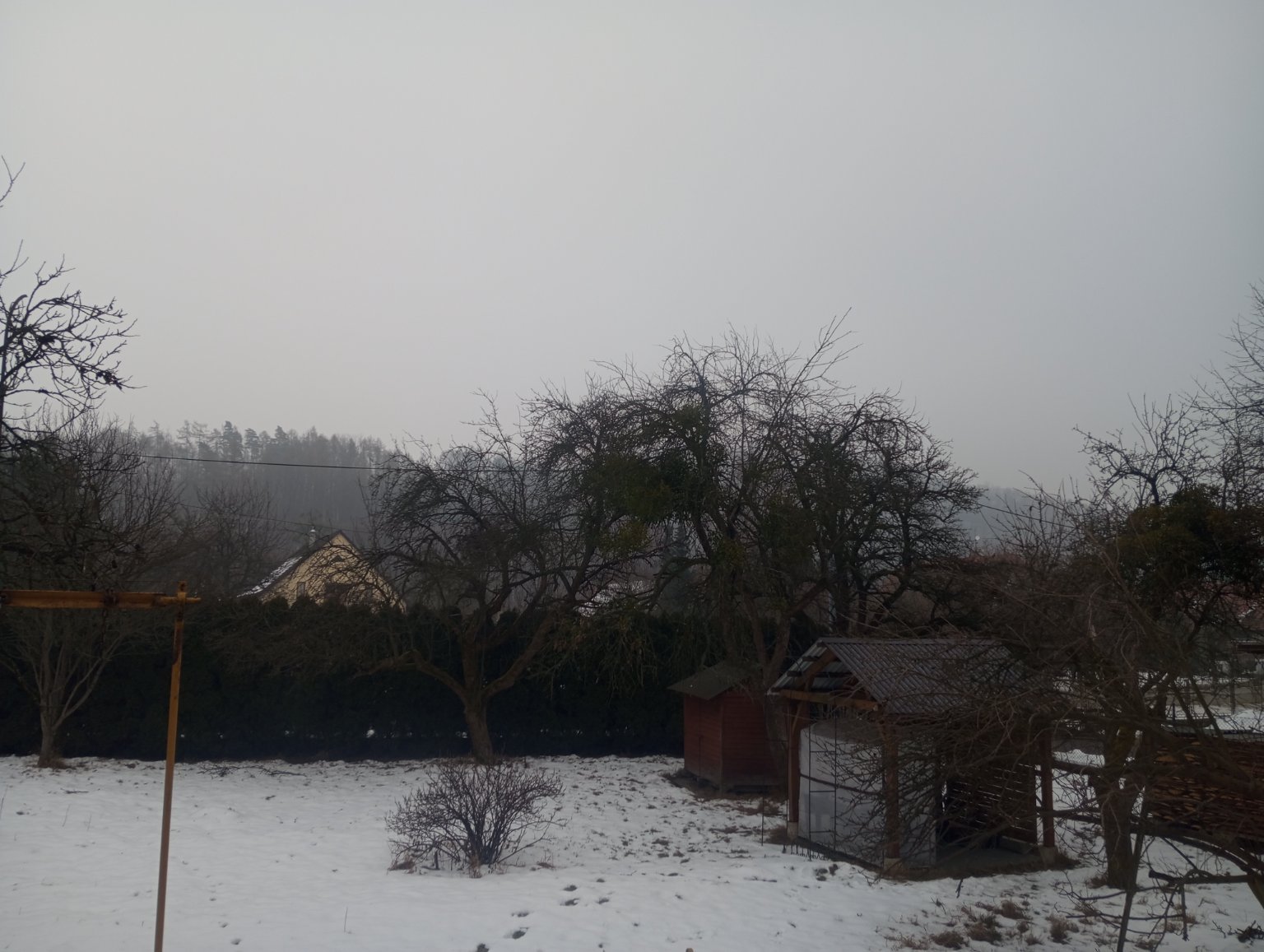zataženo a mlhavo, místy ledovka, od večera se pozvolna otepluje, -0.5°C