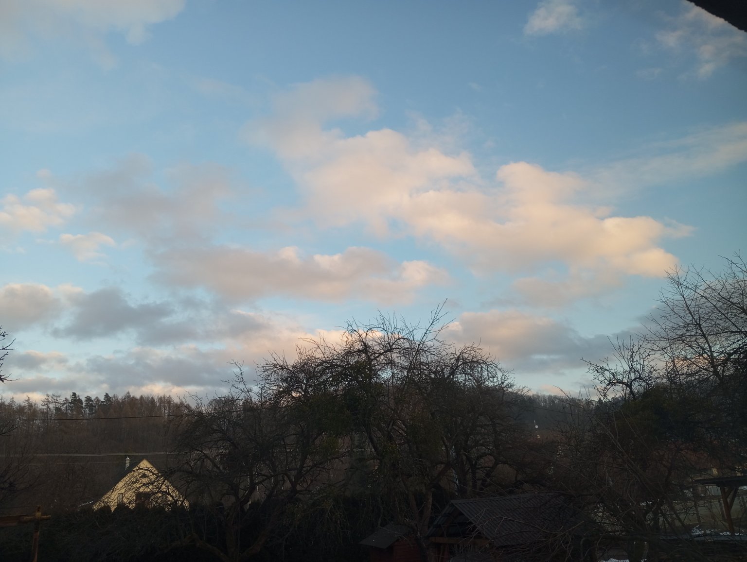 Rosný bod 0,2°C, vlhkost 95%. Tlak 1001,47 hPa. Vánek. Zimní období včera skončilo, sněhová pokrývka držela nepřetržitě takřka celý měsíc (od 29. prosince), což už tady dlouho nebylo. Ze Slovenska se natahuje mlha.