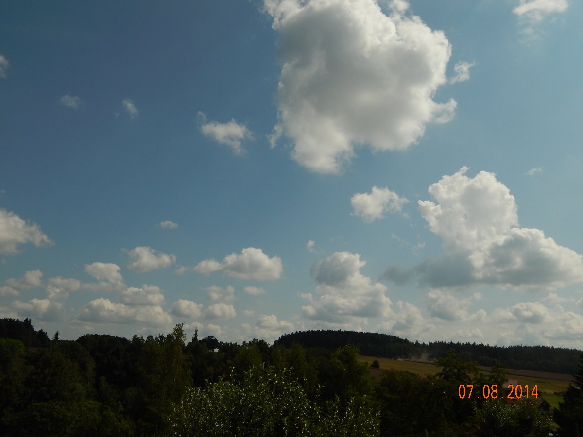 Sluníčko si hraje na schovávanou. V roce 2013 bylo horko. 30 st.C. Tlak 1016 hPa, vítr S, 1 m/s.