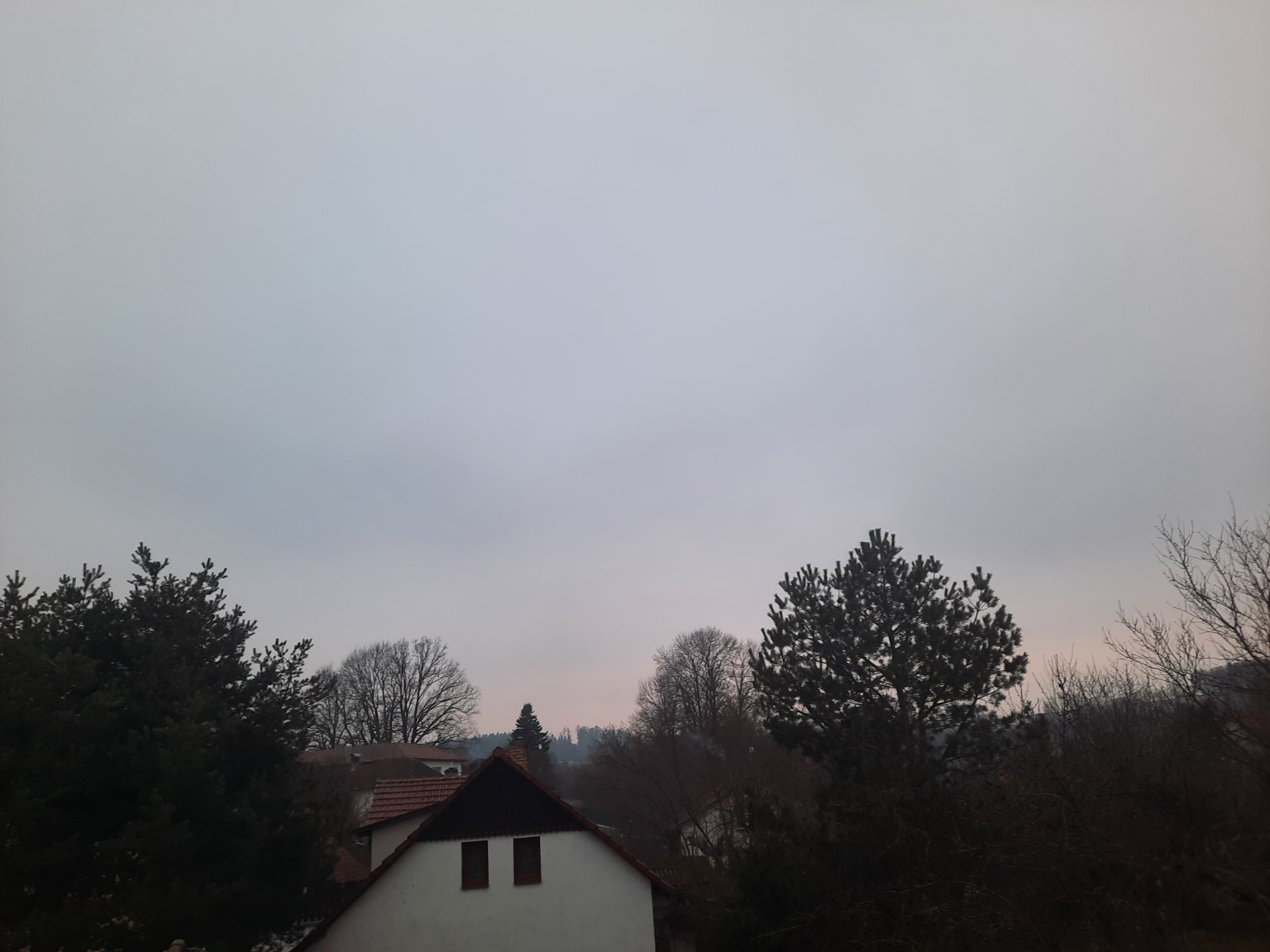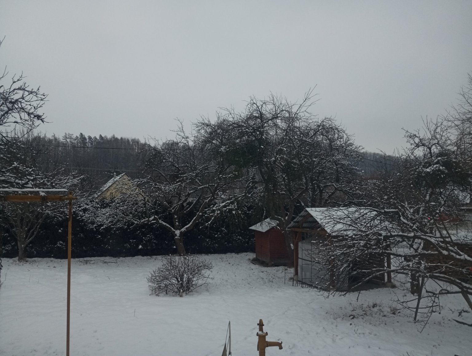 Slabé sněžení, občas intenzita sněžení zesílí nebo zeslábne. Padají i větší vločky. Poprašek.