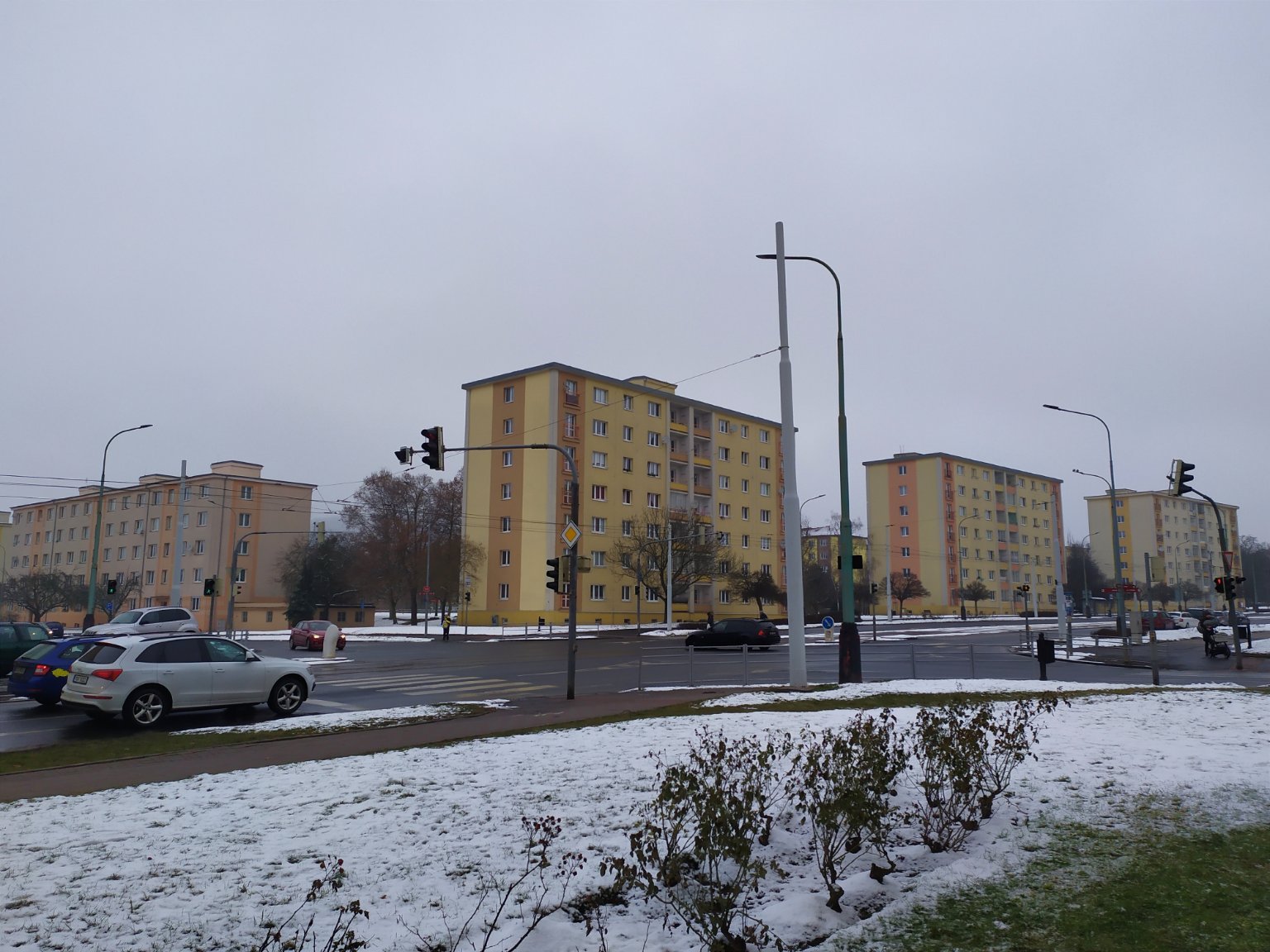 Mlhavo, sníh už roztál prakticky všude kromě trávy a na krajích chodníků. Poprašek.