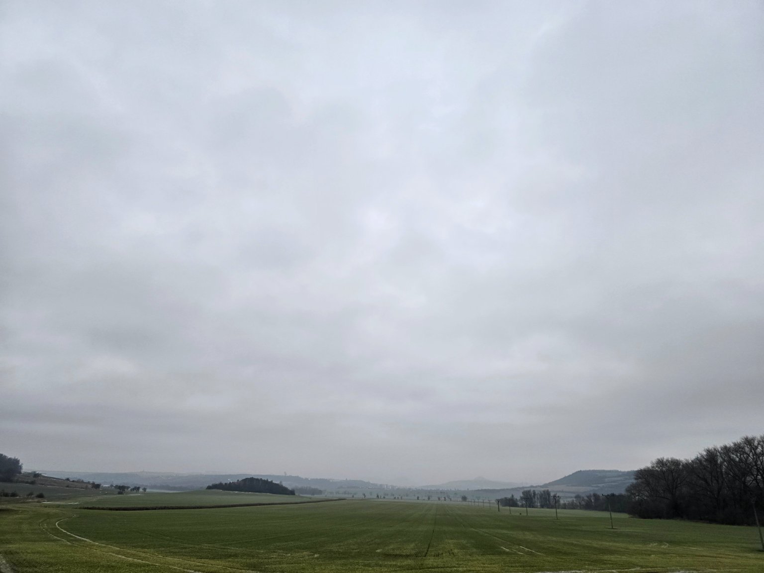 Odpoledne se oblačnost částečně protrhala. Sníh jsou malinké zbytky, případně v údolích, na některých kopcích, u lesů apod. Louka na fotce je vyjímkou. Obleva zatím nedorazila, Tmax +2,3 C, nyní klesá.