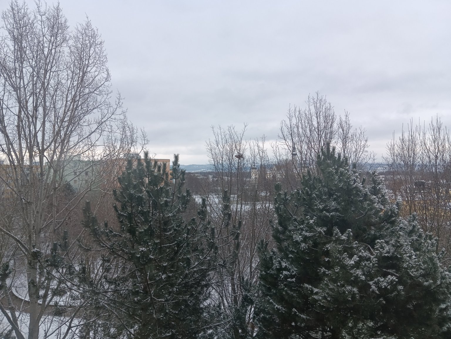 Zataženo, díky mokrému sněhu jsou krásně obalené stromy. Napadly cca 3 cm sněhu.