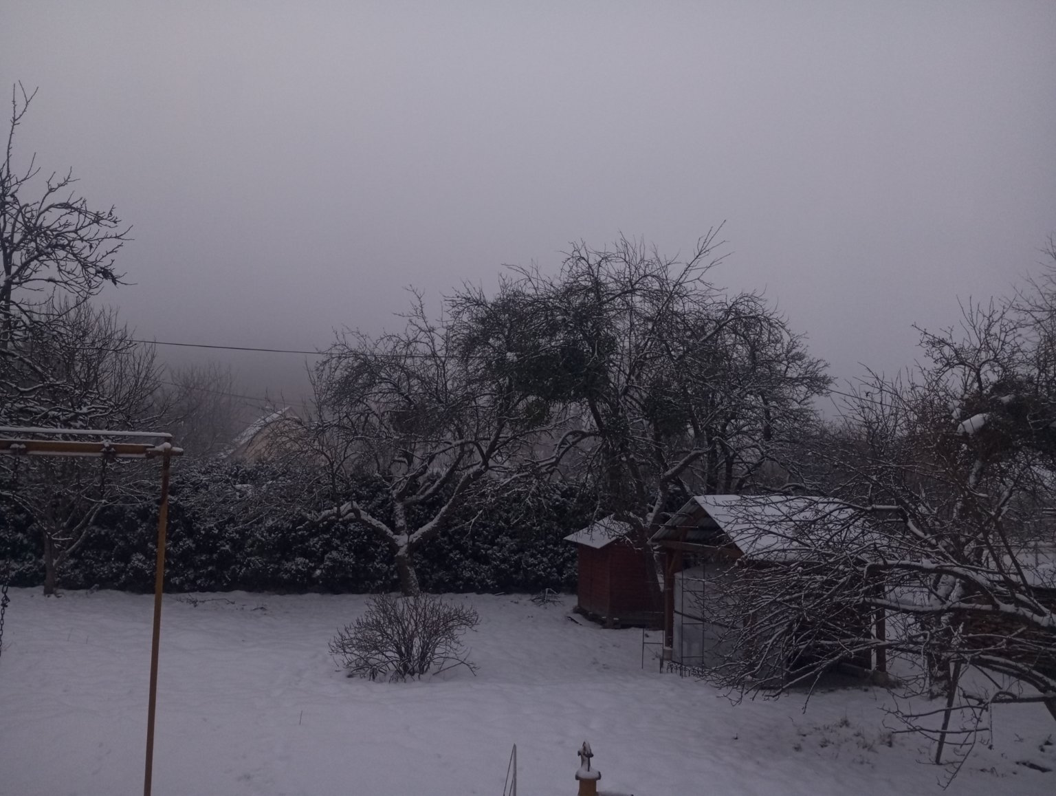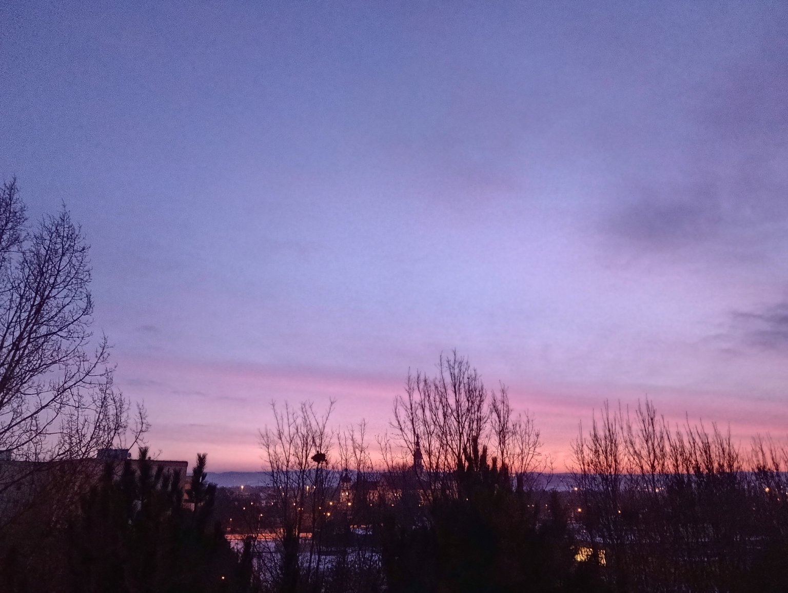 Většinou oblačno, pěkné červánky. Cca 5 cm sněhu.