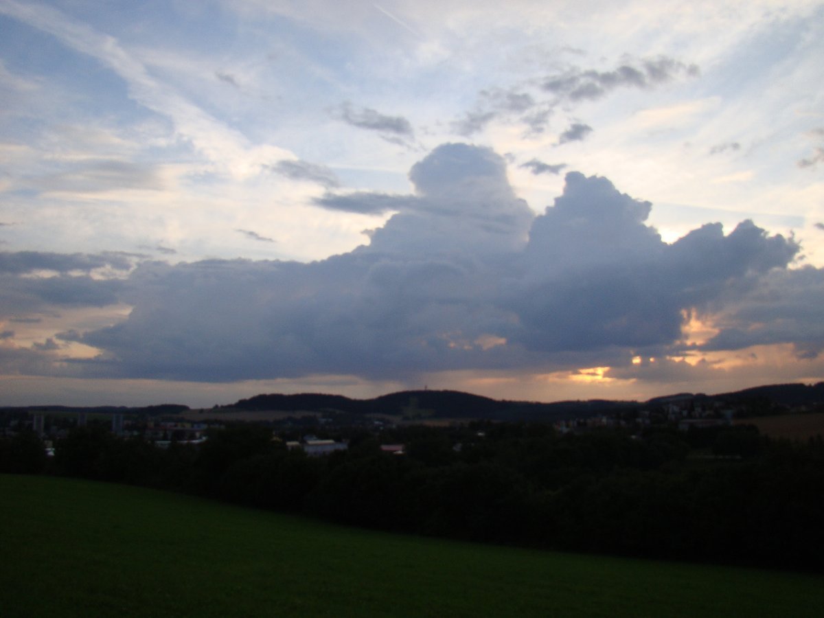 Po bouřce s velmi silnými srážkami, pravděpodobně i self cloudem, který přešel dřív, než jsem měl možnost jej vidět. Celé čelo bouře mělo ostrou, půlkruhovou hranici, směrem jejího pohybu. Při přechodu velmi silné nárazy větru. Následoval delší, slabý déšť a nyní pomalu slábne. Při západu slunce se oběvila silná, téměř červená, dvojitá duha s plošným zesvětlením. Západ sám byl velice působivý a zcela měnil svůj vzhled a barvy celých 20 minut. Na fotce konečná fáze s krepuskulárními paprsky, potom už barvy slábly. Bohužel jsem neměl s sebou stativ, za což se omlouvám.