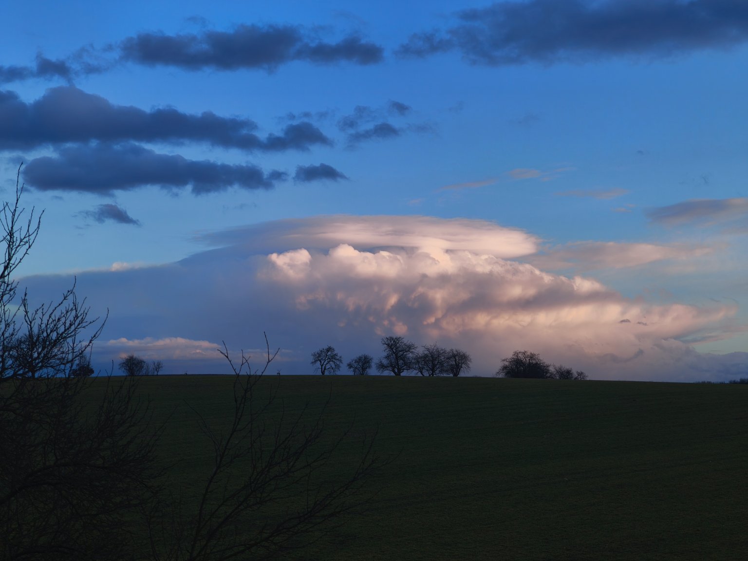 Jasno až skoro jasno, na západě v dáli začínají zase kupy ale nejsou tak silné a trochu se rozpadaj. Bezvětři nebo vánek
