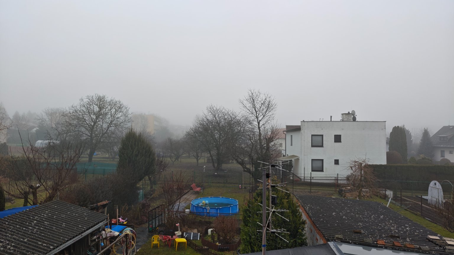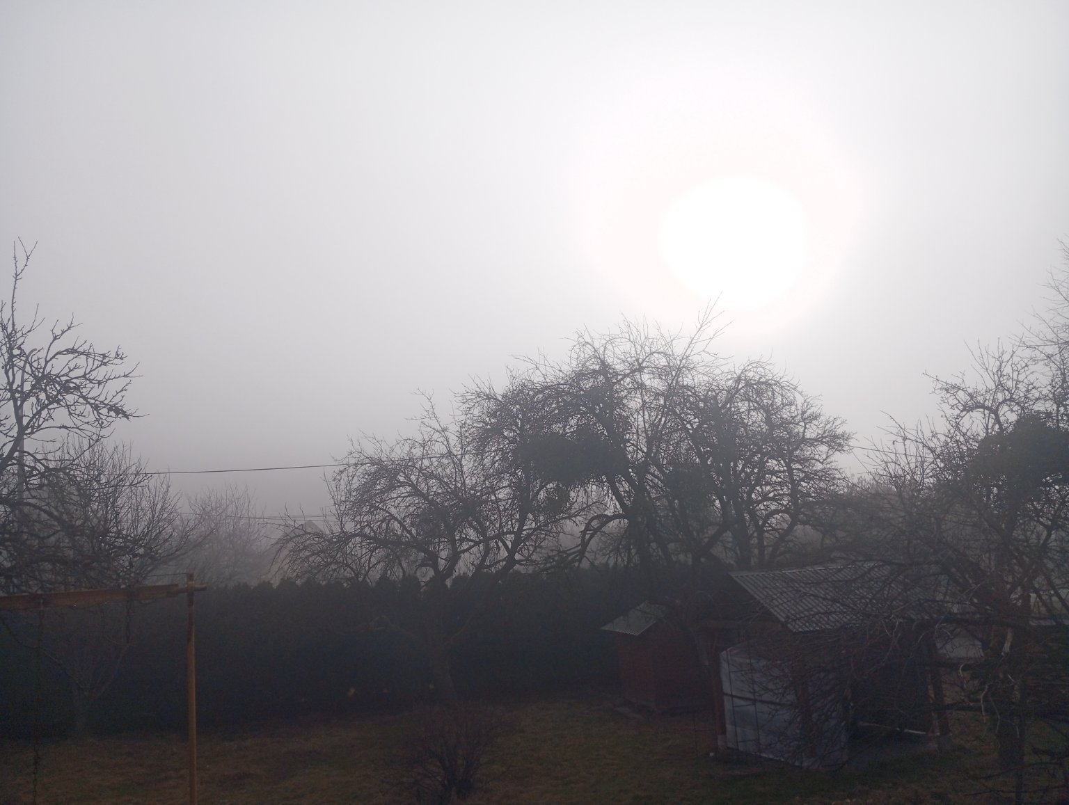 Stále mlha již od pozdního večera, klidno nebo jen velmi slabý vítr, tlak 1029,2 hPa.