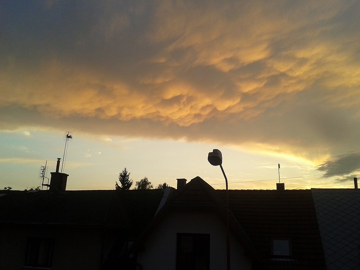 Přestalo pršet,dnes 2 mm srážek,klidno,tlak 1012hPa,vlhkost 79%.Obloha při západu Slunce.