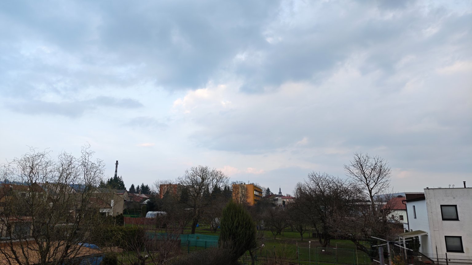 Oblačno, klidno, tlak 1022 hPa.