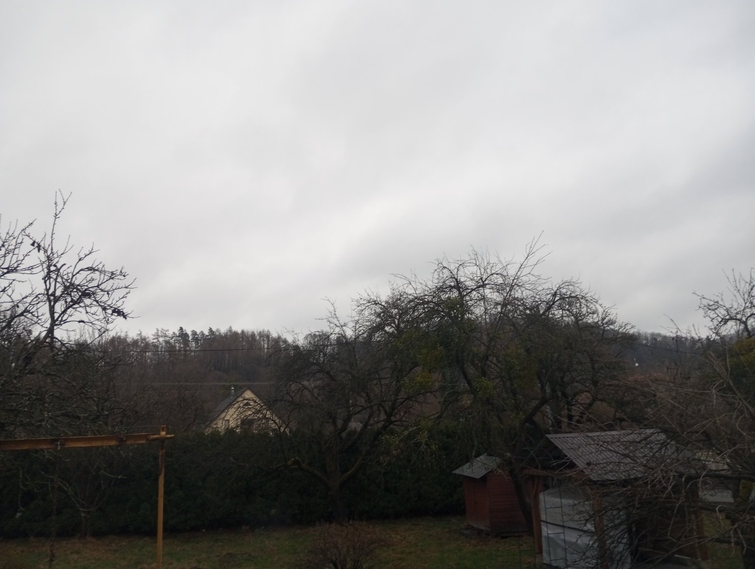 1,3°C, Velmi slabý sníh s deštěm, Sníh: nesouvislý. Nic nepřipadlo a taje to... A ještě k tomu je déšť se sněhem a vítr, uplně ideální na bolest v krku... :-/ Aspoň na kopcach v okolí je hezký bílo...