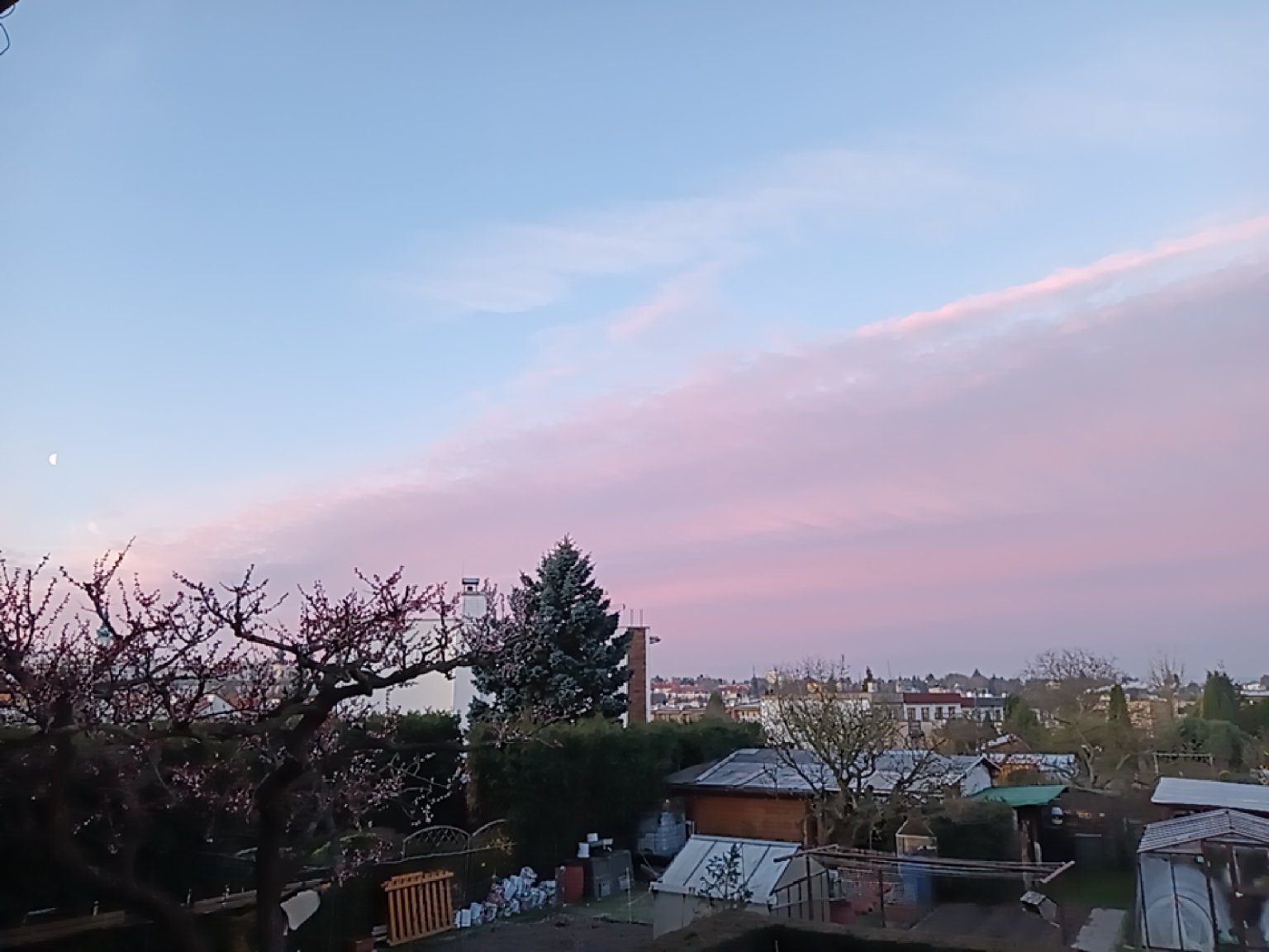 Bezvětří, krásný východ Slunce s náznakem halového sloupu