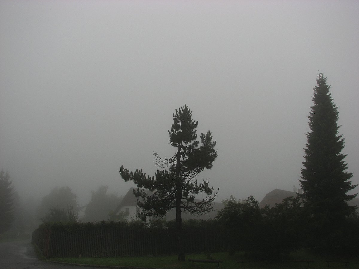 stále jmené prší - obloha je jako šedivá mokrá deka - foto z 2014 09 02 v 07:55 zachycuje tu nevýraznou oblohu - zato v potoce je zeleno a voda se žene větší rychlostí než jindy