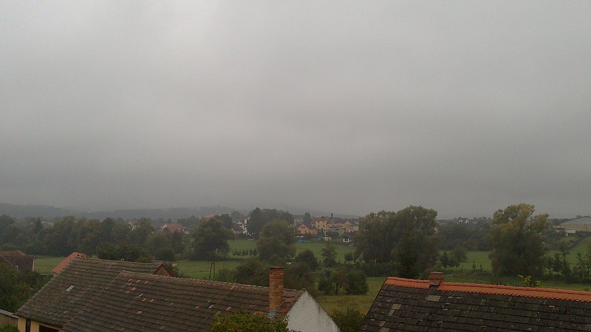 Zataženo, po přeháňce. Bezvětří, tlak 1014,1 hPa.