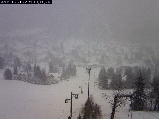 Sněží vítr z 2,9m/s pociťová teplota -3,1°C vlhkost 95%.