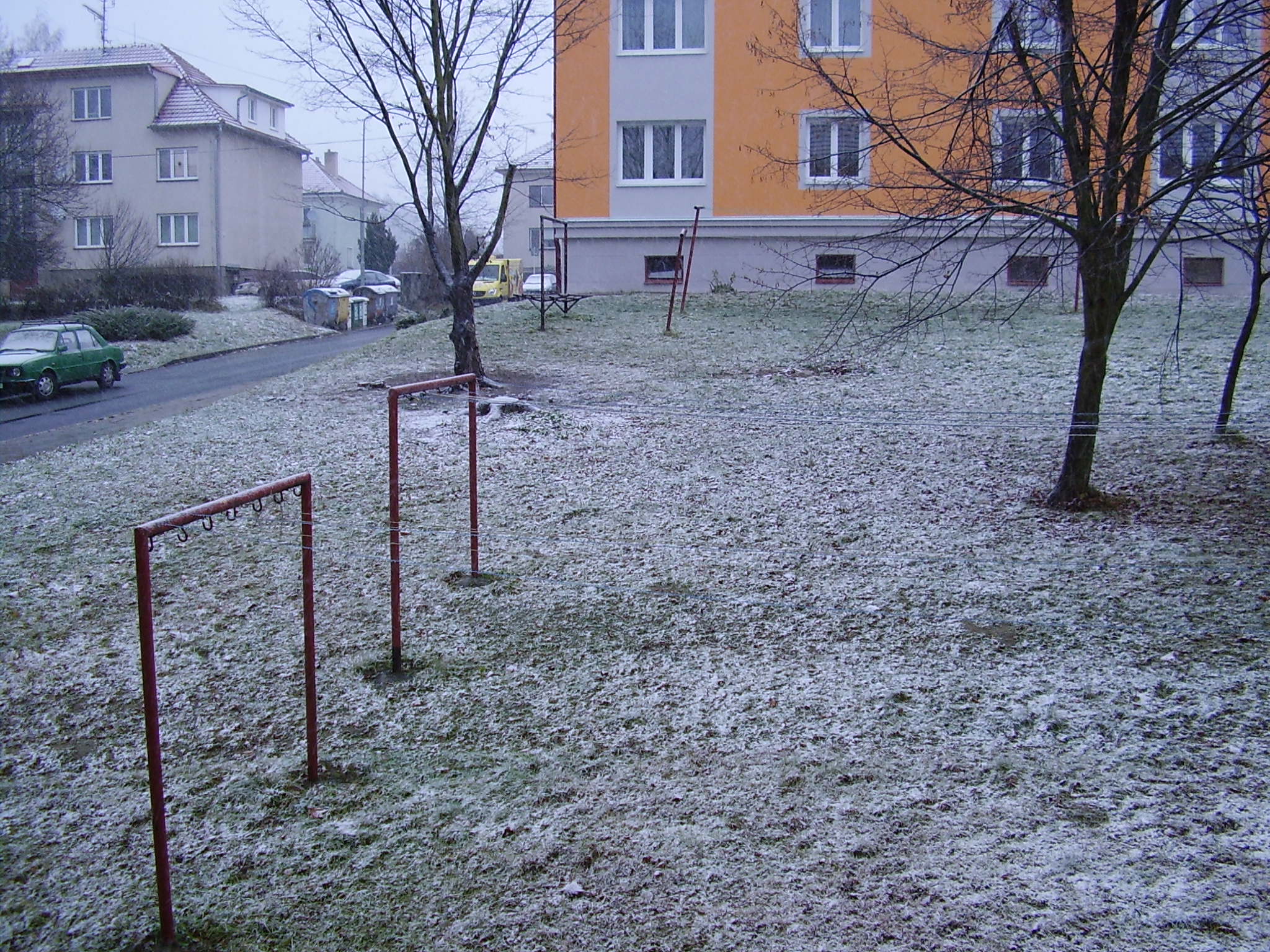 zataženo,mírný vítr,sněží.Jsou plusové teploty,takže se sníh zatím nedrží.