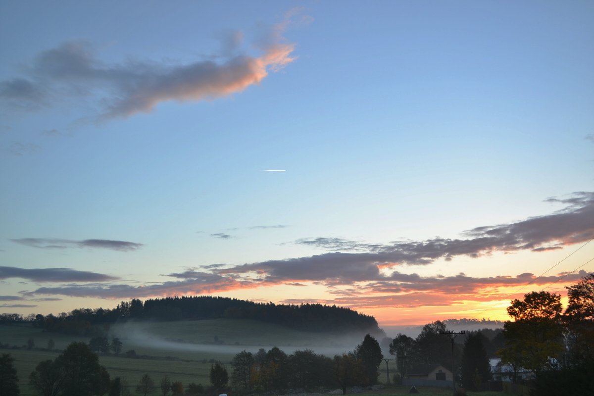 Jasno klidno, údolím se hrne slabá mlha .