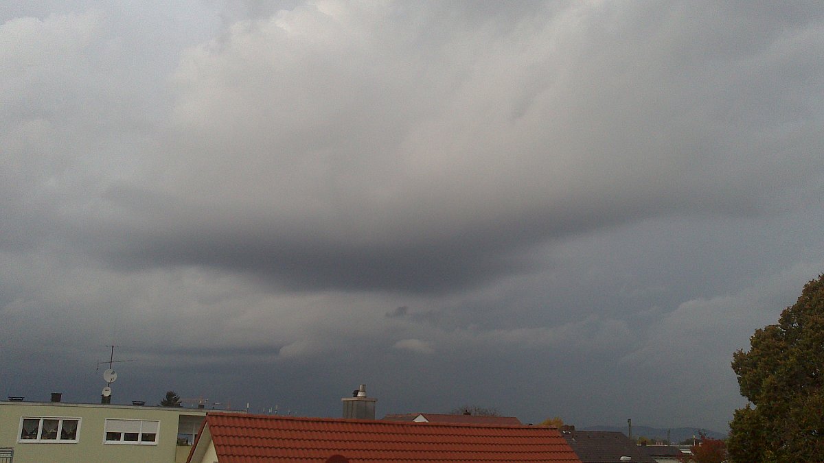 vlhkost 72%, pohled SZ na blížící se pás srážek, zatím skoro zataženo