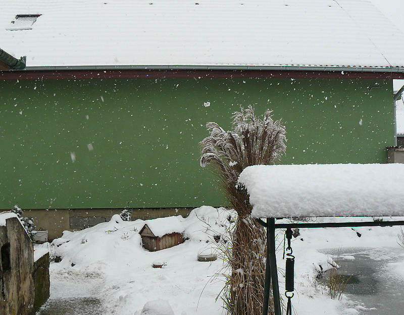 Zataženo a pořád padá.Tlak 1004,3 mb,viditelnost 1000 m, vítr 0,5 m/s,vlhkost 93%,sněhu je asi tak 20-25 cm.