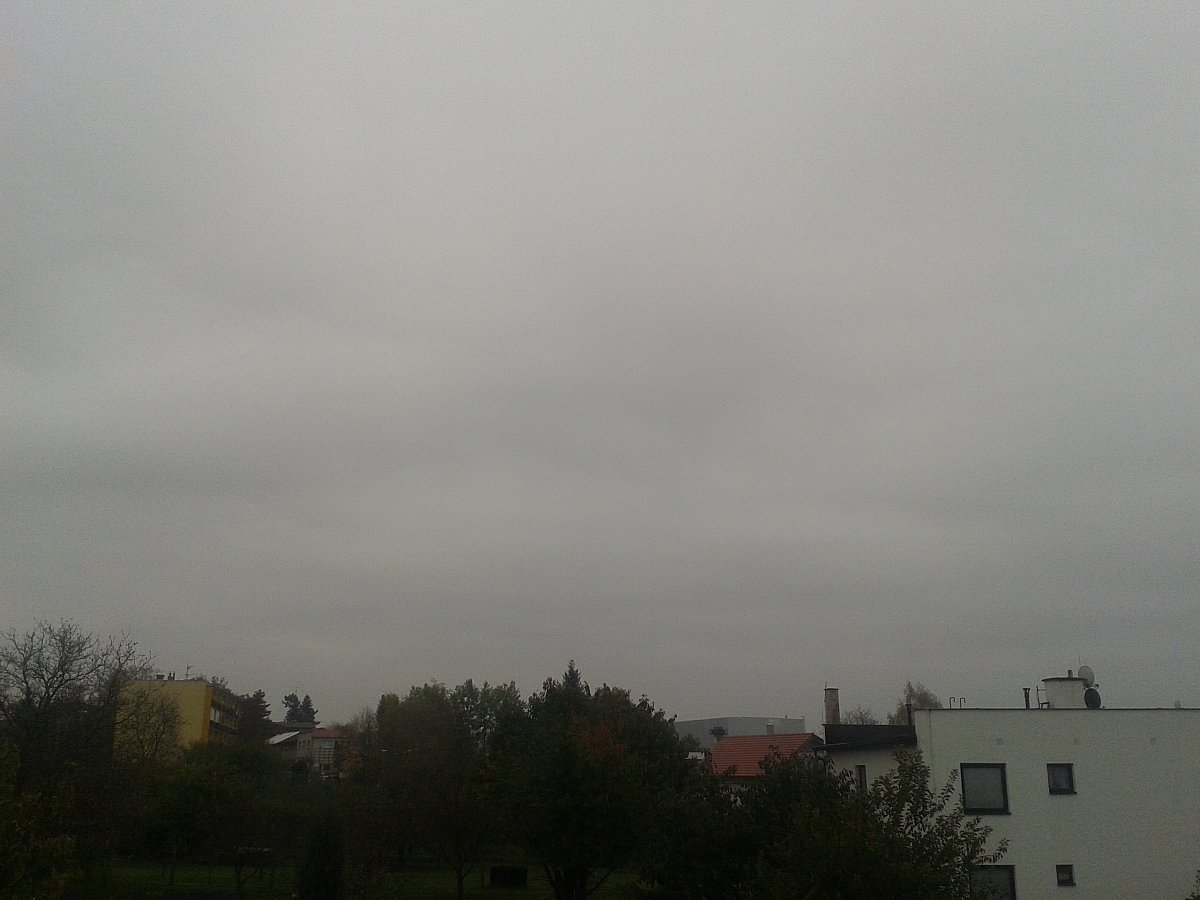 Zataženo nízkou oblačnosti (Stratus), kouřmo - dohlednost 1,3 km. JV vítr 5 km/h, tlak 1020,6 hPa a vlhkost 91 %. Mírně mrholí.