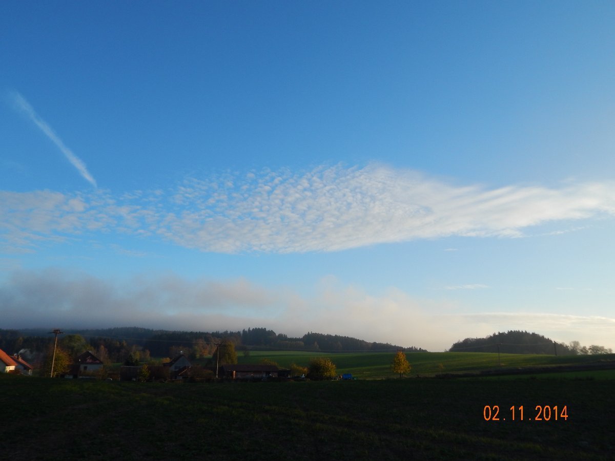 Západ slunce do vysoké oblačnosti, pozorovatelná jsou i vedlejší slunce (parhelia)