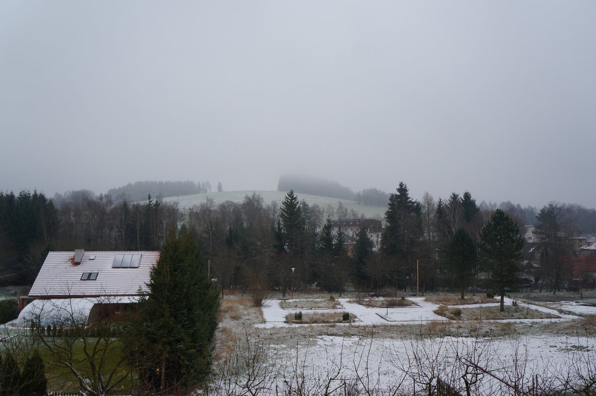 Dohlednost 300 m, JV vítr 10 km/h, tlak 1018,7 hPa a vlhkost 99%. Namrzající mrholení.