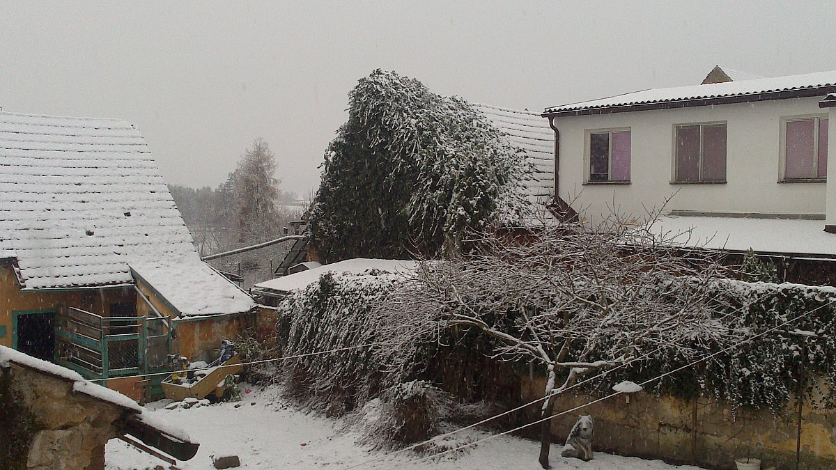 Ráno pršelo a tak od 8:00 začlo hustě sněžit a vytvořil se celkem pěkný poprašek sněhu:) Nyní stále poletujou vločky. Zima je tu!! :)