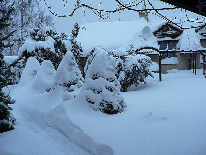Zataženo, slabě sněží.Od rána je pořád stejně,ani se nechce rozednít. Asi bude hned večer.