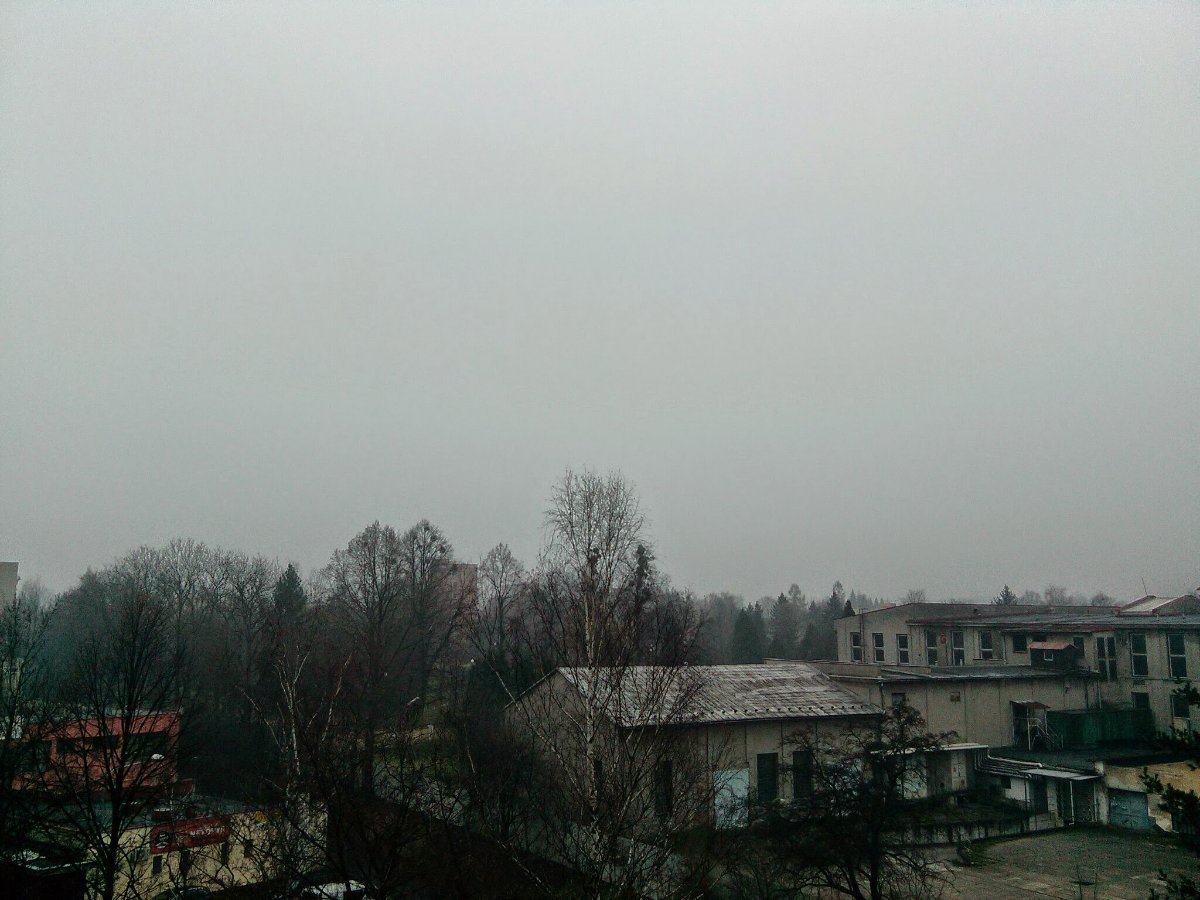 Kouřmo, Harusův kopec zahalen v nízké oblačnosti. Vítr severního směru 9 km/h, tlak 1019,7 hPa a vlhkost 95 %. Dohlednost do 3 km.
