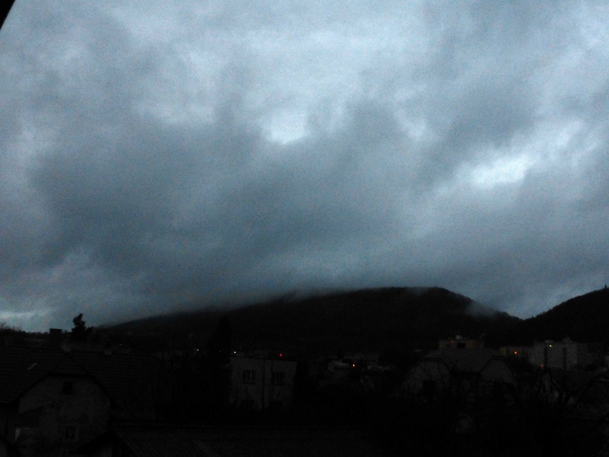 Je zataženo, po dešti, přeháňky deště se sněhem. Západní vítr.