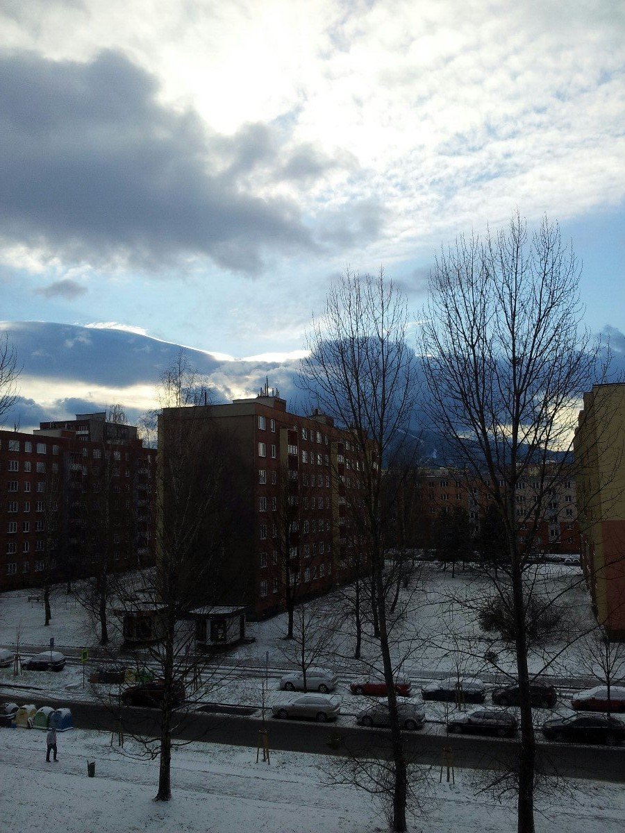 Ráno něco pod nulou. Momentálně polojasno - poletuje sníh, přestože svítí slunce.