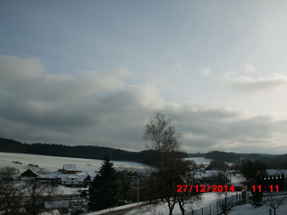 Skoro zataženo, JV vítr 9 km/h v nárazech 18 km/h, tlak 1013,5 hPa a vlhkost 75 %.