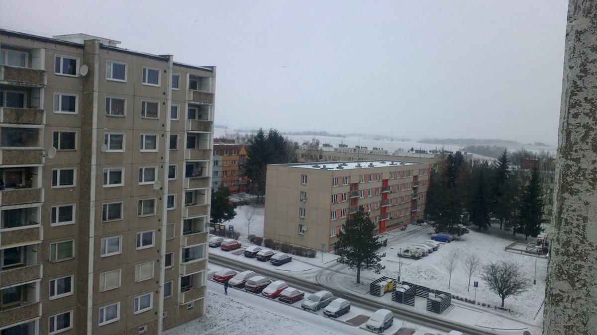 Napadalo přes 5cm nového sněhu. Čerstvý vítr vytváří jazyky a sfoukává sníh ze střech a stromů.