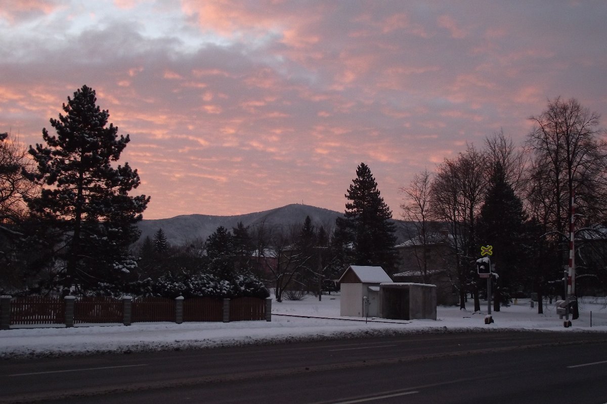 Vítr Z 4,2 km/h, vlhkost 87%, sníh slehl na 9 cm, v pozadí zámek Zbiroh.