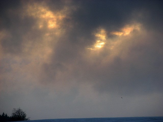 foto z 2015 01 04 v 08:57 zachycuje snahu sluníčka dostat se z mraků ven - teplota byla +1°, trochu sněhu je tam, kam se sluníčko nedostalo, dokonce ráno byl poprašek - ale už po něm není vidu