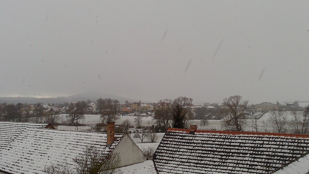 sněhové přeháňky, fouká silnější vítr, sníh trochu odtává