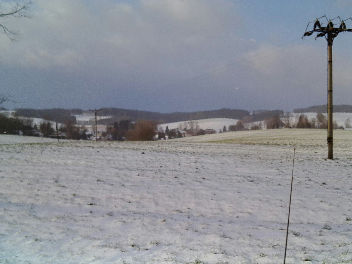 Máme tady sněhovou bouři, totální bílá tma... foto je asi o 5 minut později, to stromy nebyly vidět vůbec a spadlo i pár krup, silný vítr, teplota spadla o dobré 2°C