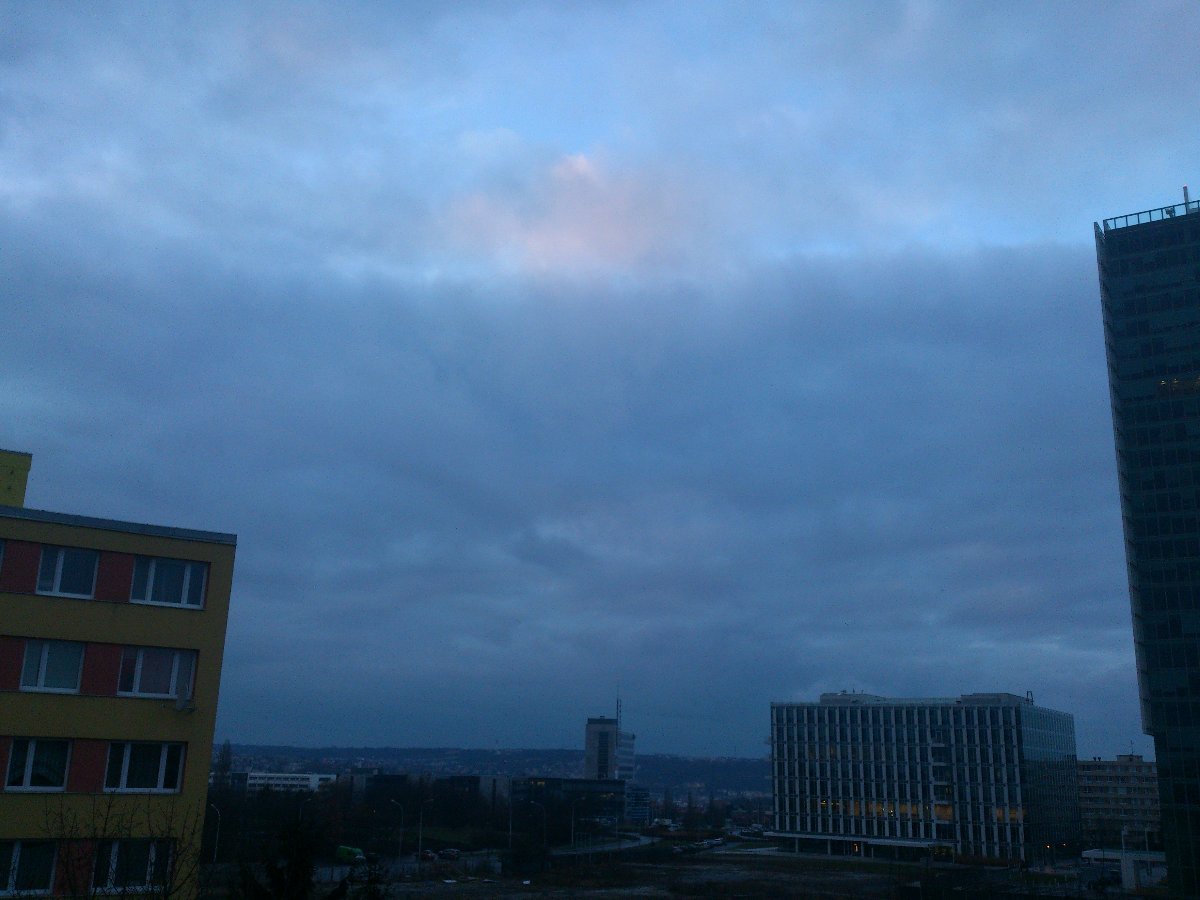 Skoro zataženo, SZ vítr 22 km/h, tlak 1024,5 hPa a vlhkost 94 %.