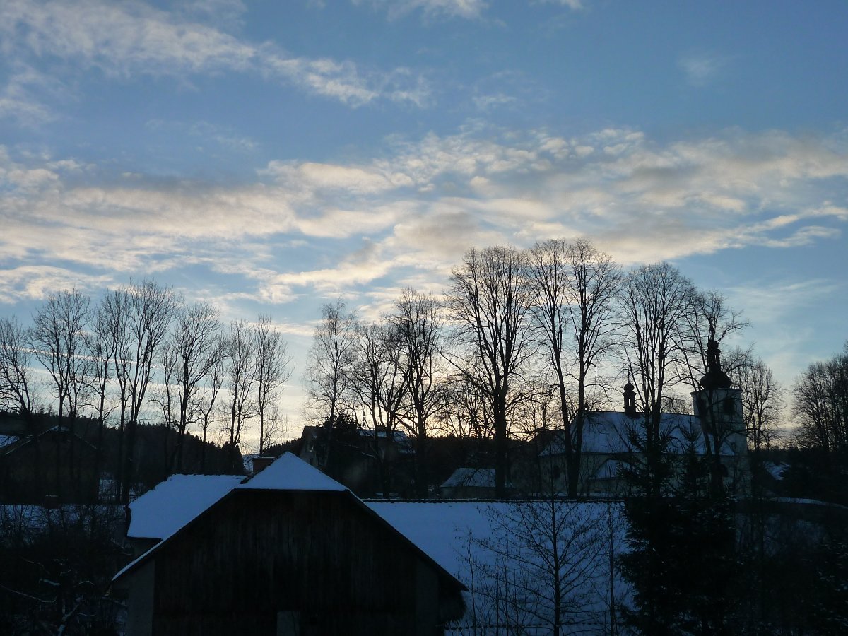 Ráno napadly cca 3 cm nového sněhu. Polojasno, ale přibývá nízká oblačnost. Tlak zatím ještě moc neklesá máme 995 hPa. Vítr: mírný jižní, ale pomalu již zesiluje. Dneska byl každopádně krásný zimní den. :)