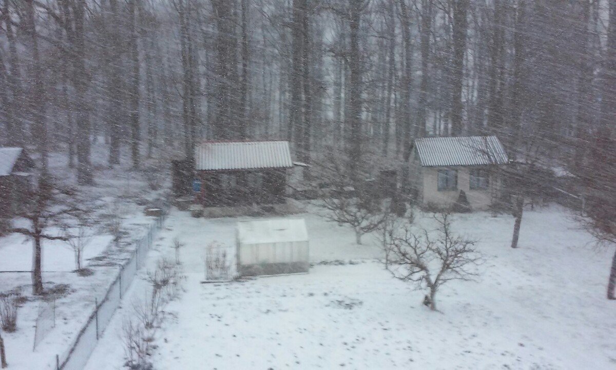 Velmi silně sněží, smetá se to. Zvonek si pěkně cpe bachor v krmítku. :)