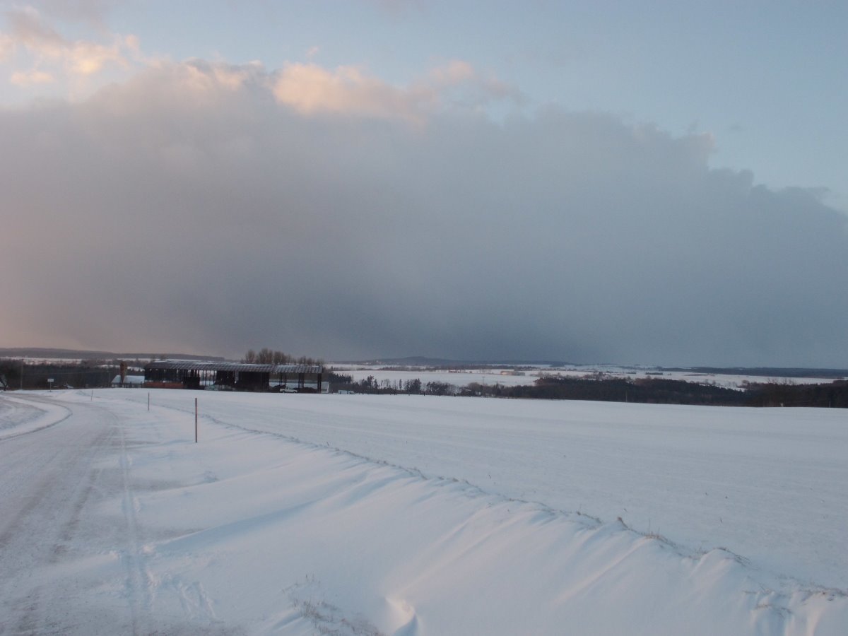 Silná sněhová přeháňka, čerstvý vítr. Sníh celkem 34 cm, nový za dnešek v hustých přeháňkách 8 cm. Foto 21.25 hod.