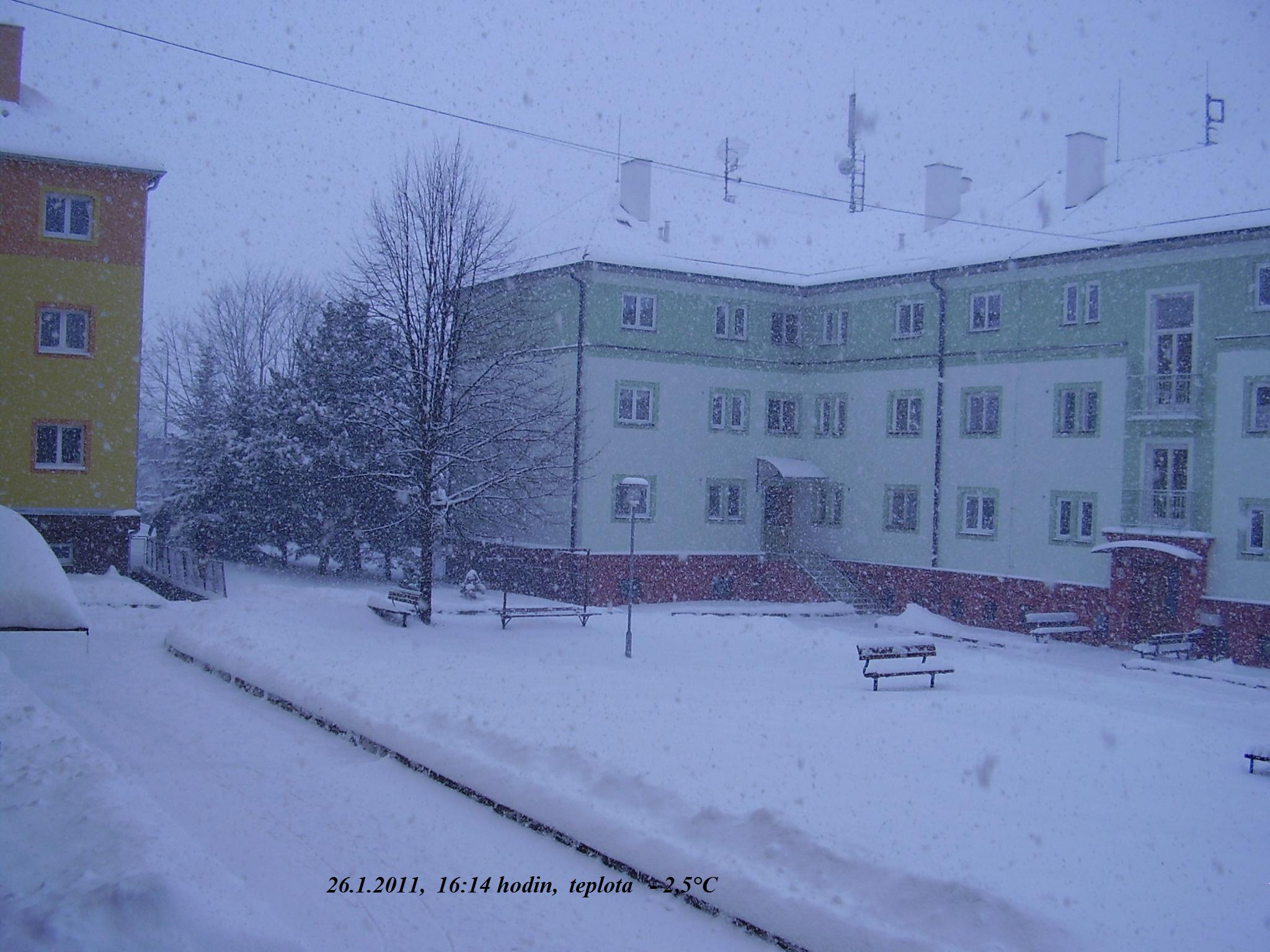 Slabí sníh,vítr 11km/h severní,tlak 1008,1hPa. Vše měřeno před 10min.
