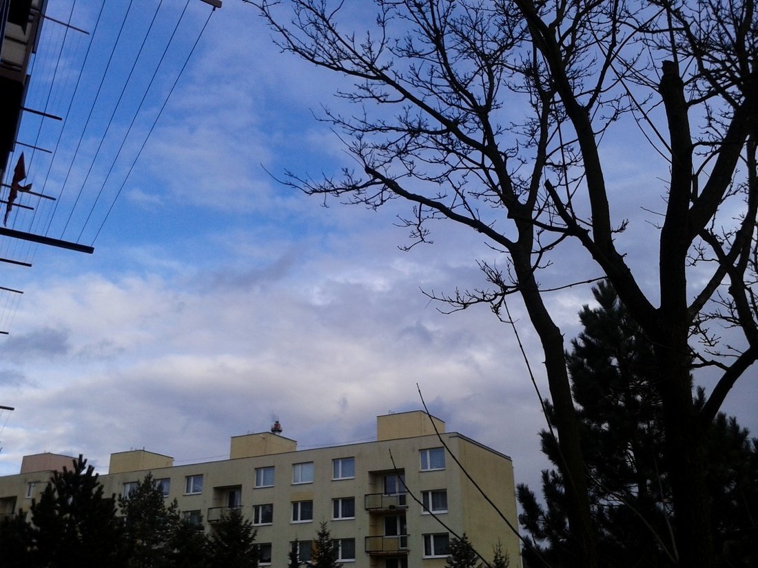 Odpoledne se vyjasnilo, hezky, slunečno, klidno. Tlak 996 hPa, vlhkost 40%, vítr S, 0,6 m/s.