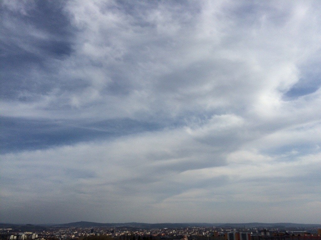 Přes vysokou oblačnost prosvítá slunce, JV vítr výrazně zeslábl.