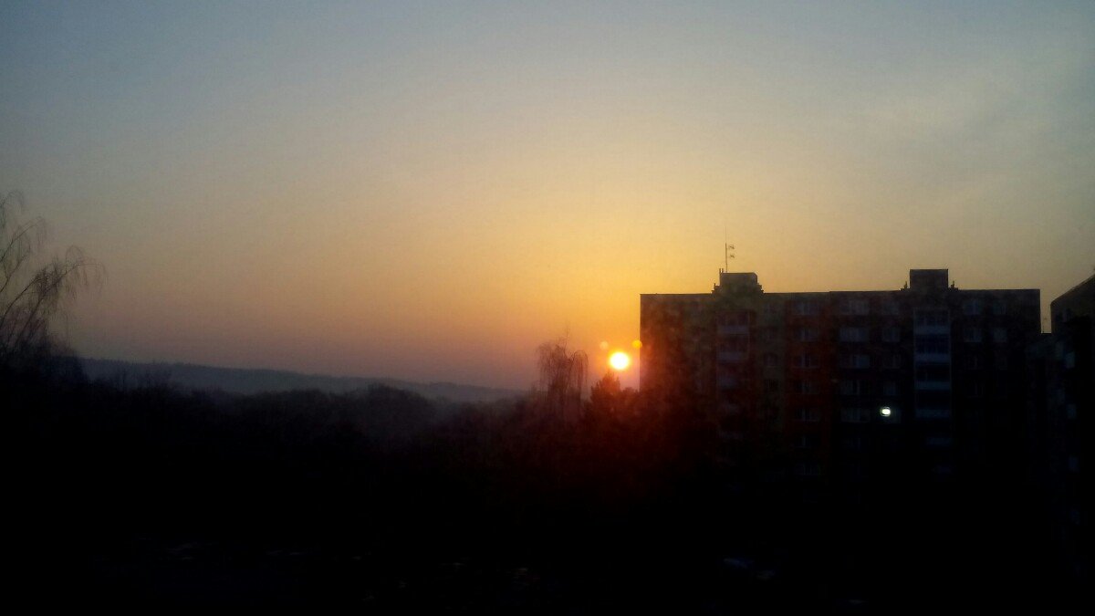 JV vánek, tlak 1010,4 hPa a vlhkost 92. Nad městem se drží mlžný opar.