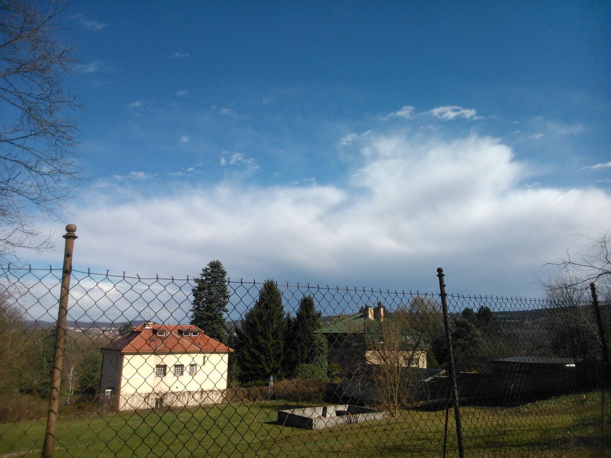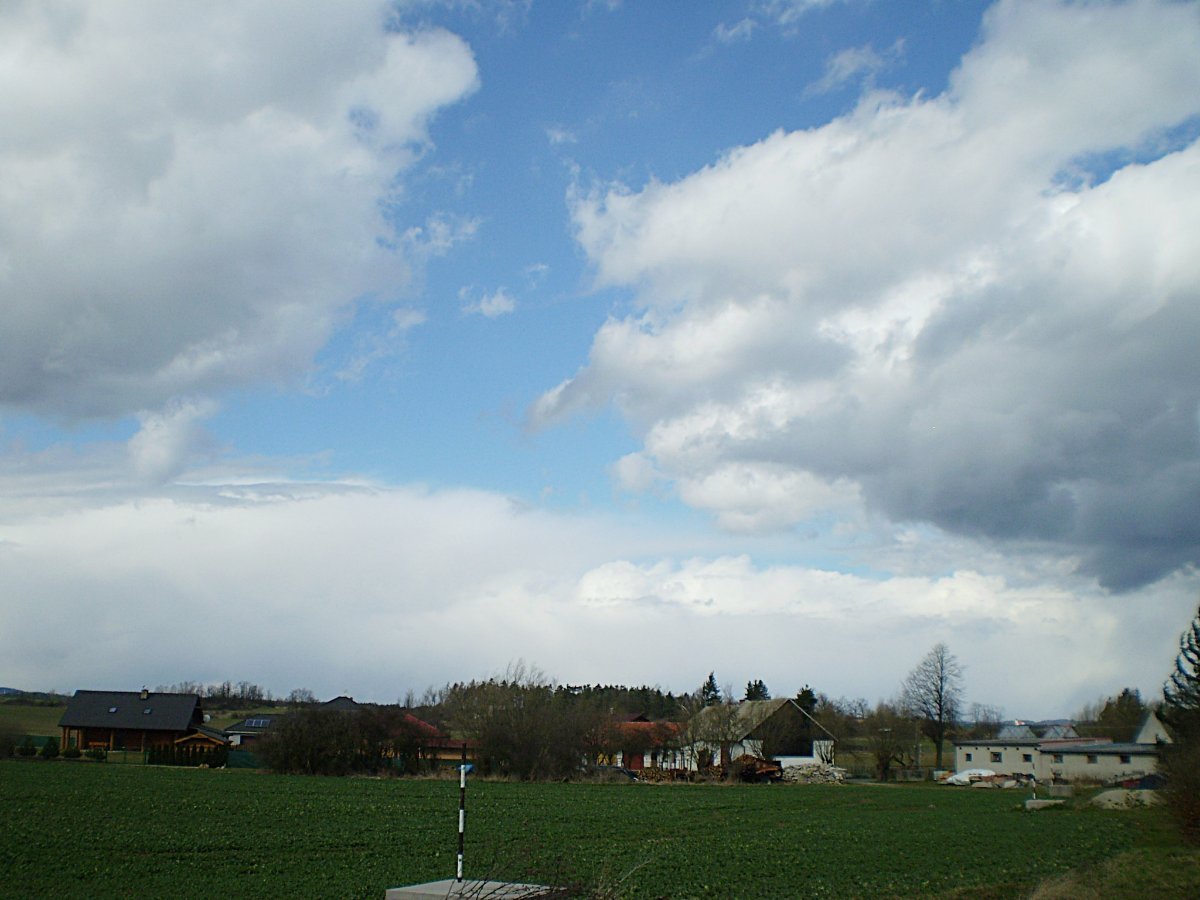 Před chvíli se tu prohnala další přeháňka se sněhovými krupkami, na fotce pohled na její odchod dále na jih, kdy se na ní vyskytlo i několik blesků (podle detekce).