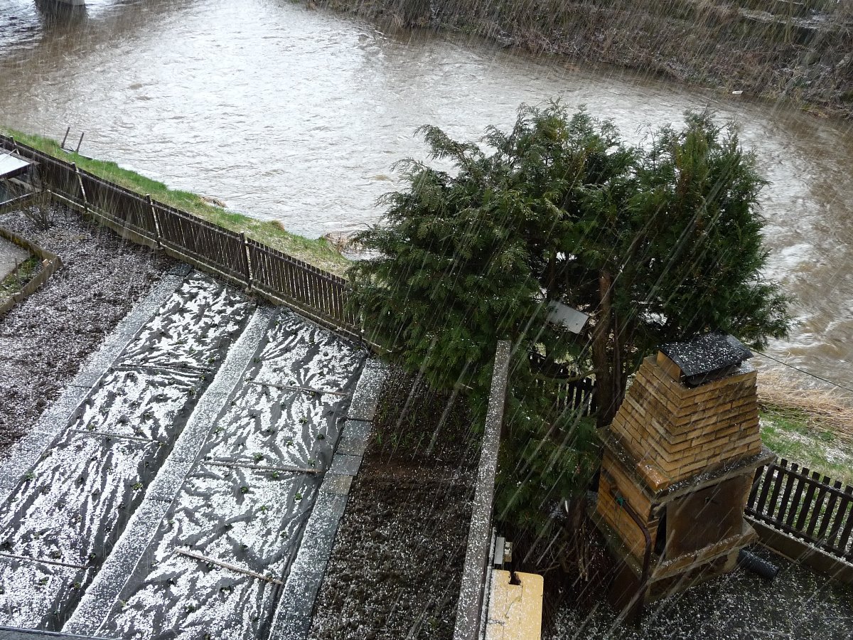 Právě se přehnala silna deštová přehánka s malýma krupkama a silnym nárazovym větrem.