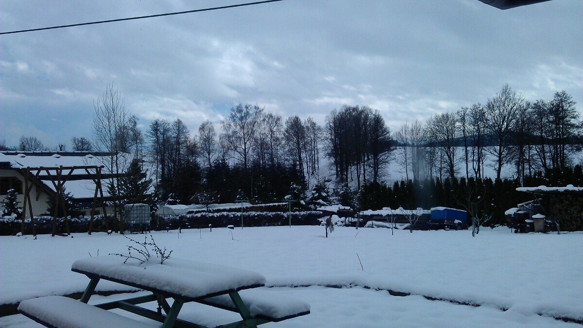 Občas smíšené srážky, mírný vítr. Sníh nový za dnešek 6 cm-mokrý. Foto 13.37 hod.