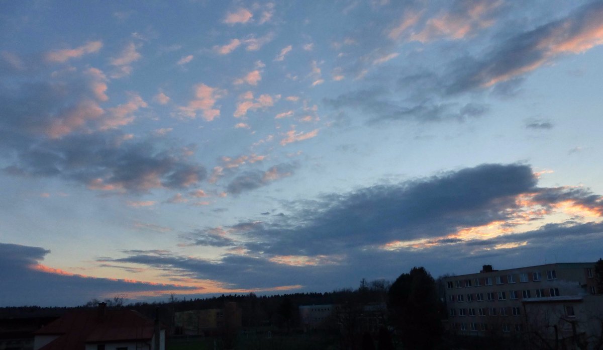 Oblačno, SZ větřík, tlak 1016 hPa.