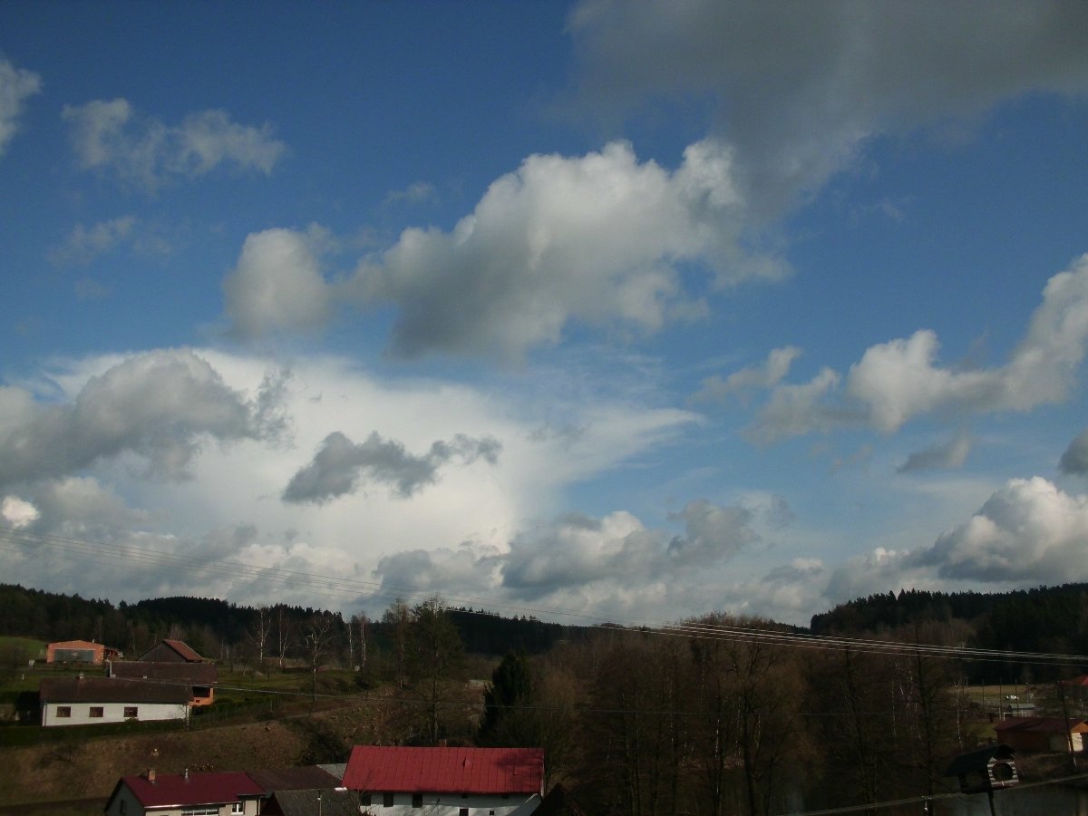 Silná sněhová přehánka, mírný vítr. Foto nahoře v rohu je po přeháňce. Sníh nový dnes zatím 0,5 cm, celkem 4,5 cm - mokrý.