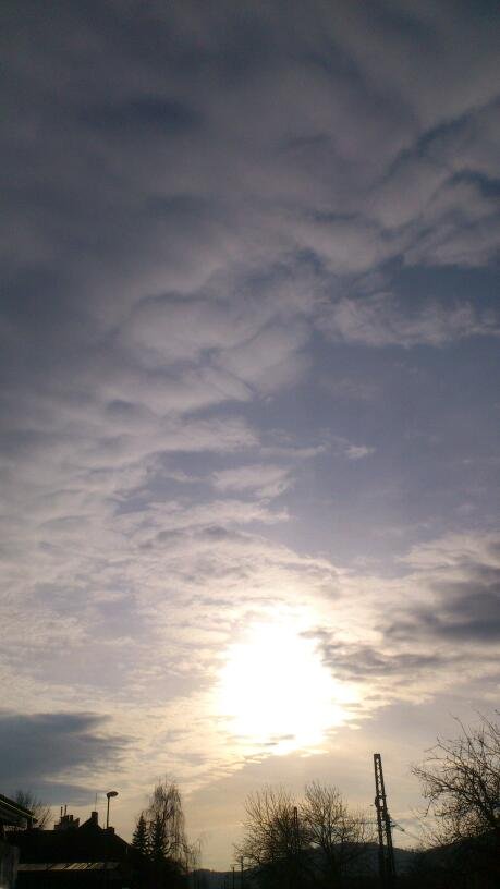 Skoro zataženo,slabý až mírný vítr,tlak 1029hPa.Teplota i tlak kleseají,před západem Slunce.